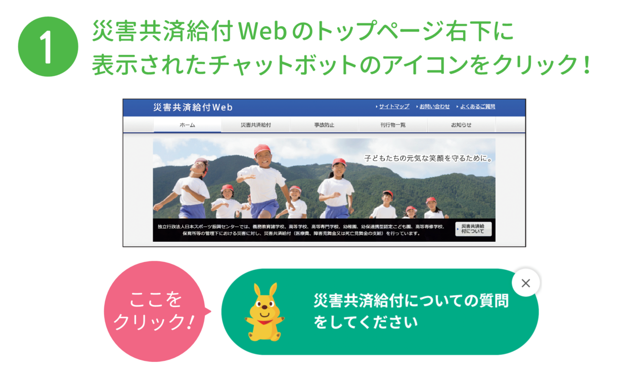 災害共済給付チャットボットの同意事項(以下、「本同意事項」といいます。)は、独立行政法人日本スポーツ振興センター災害共済給付事業部が提供する災害共済給付チャットボット(以下、「本チャットボット」といいます。)のご利用にあたって、あらかじめご了承いただきたい事項を定めるものです。実際に本チャットボットをご利用いただいた場合には、本同意事項に同意したものとします。