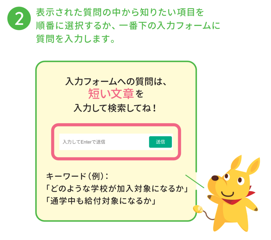 2.利用者は、本チャットボットに自己又は第三者の個人情報(氏名、学校・園名、住所、電話番号等)を入力しないでください。