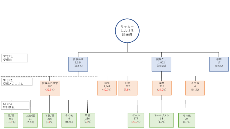 受傷機転に関して、Step 1(受傷前)では 69.5%で「他選手との接触あり」に分類されました。Step 2(直接的要因)では、最も多いのが「(他選手との接触後の)地面との接触」40.2%で、次いで 「他選手に当てられた」29.3%、「用具との接触」22.0%でした。さらにStep 3の詳細では、「他選手による打撃」内訳として 頭‐頭(13.5%)、下肢‐頭(6.4%)が多く、用具ではボールとの接触(20.3%)が中心でした(参考図)。