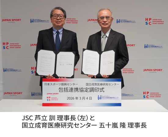 独立行政法人日本スポーツ振興センター(JSC:JAPAN SPORT COUNCIL)と国立研究開発法人国立成育医療研究センターは、それぞれの特色を活かして、学校等における事故防止、成育医療・女性の健康、スポーツ医・科学に関する研究の発展並びにそれらに基づく人材育成等を行い、社会貢献を果たすことを目的として、包括連携協定を締結しました。